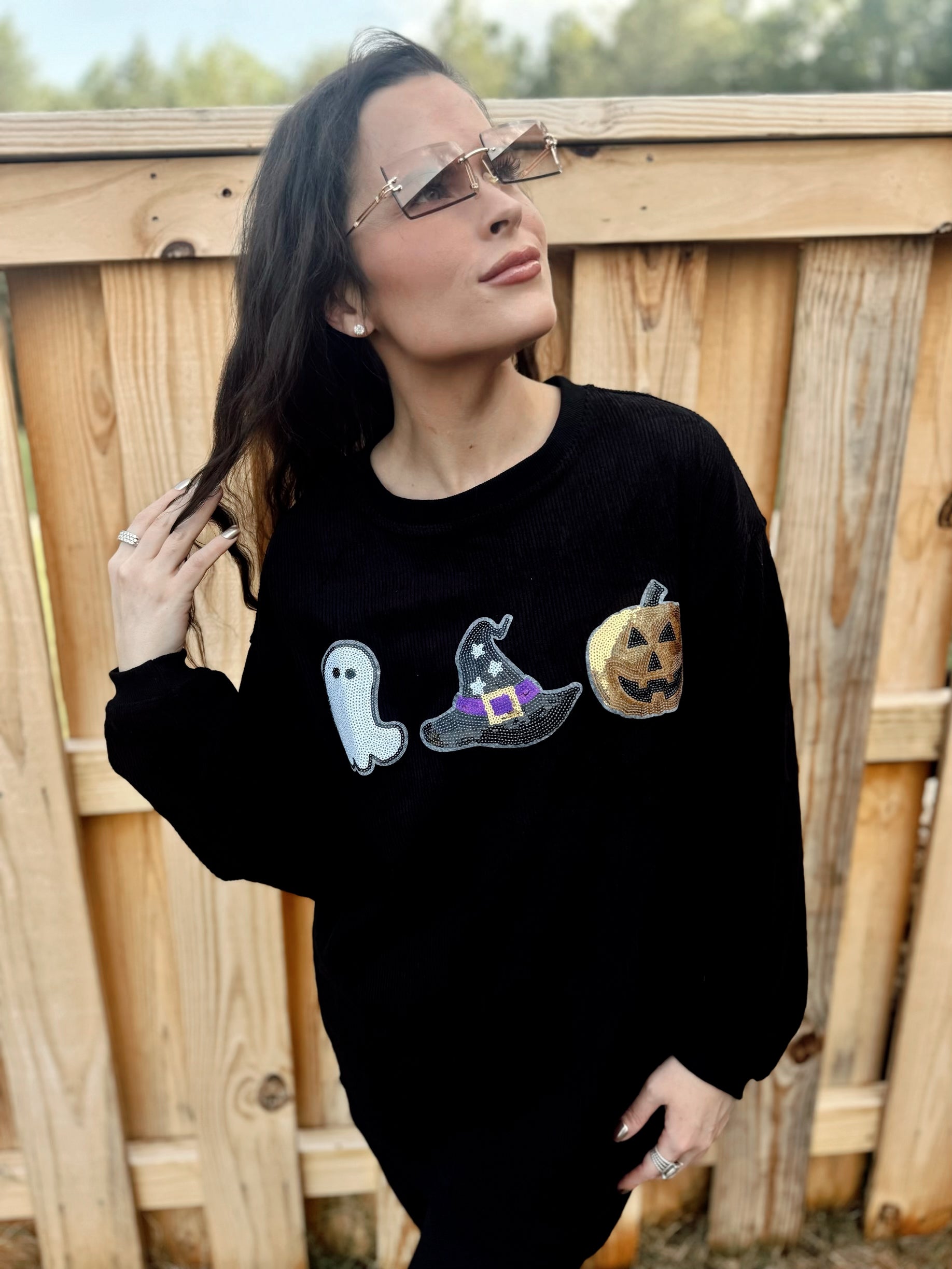 This corded crewneck features fun and festive patches including a witch hat, ghost, and pumpkin to bring some spooky style to your wardrobe. Perfect for any Halloween festivities, this crew adds a touch of playful magic to your outfit.