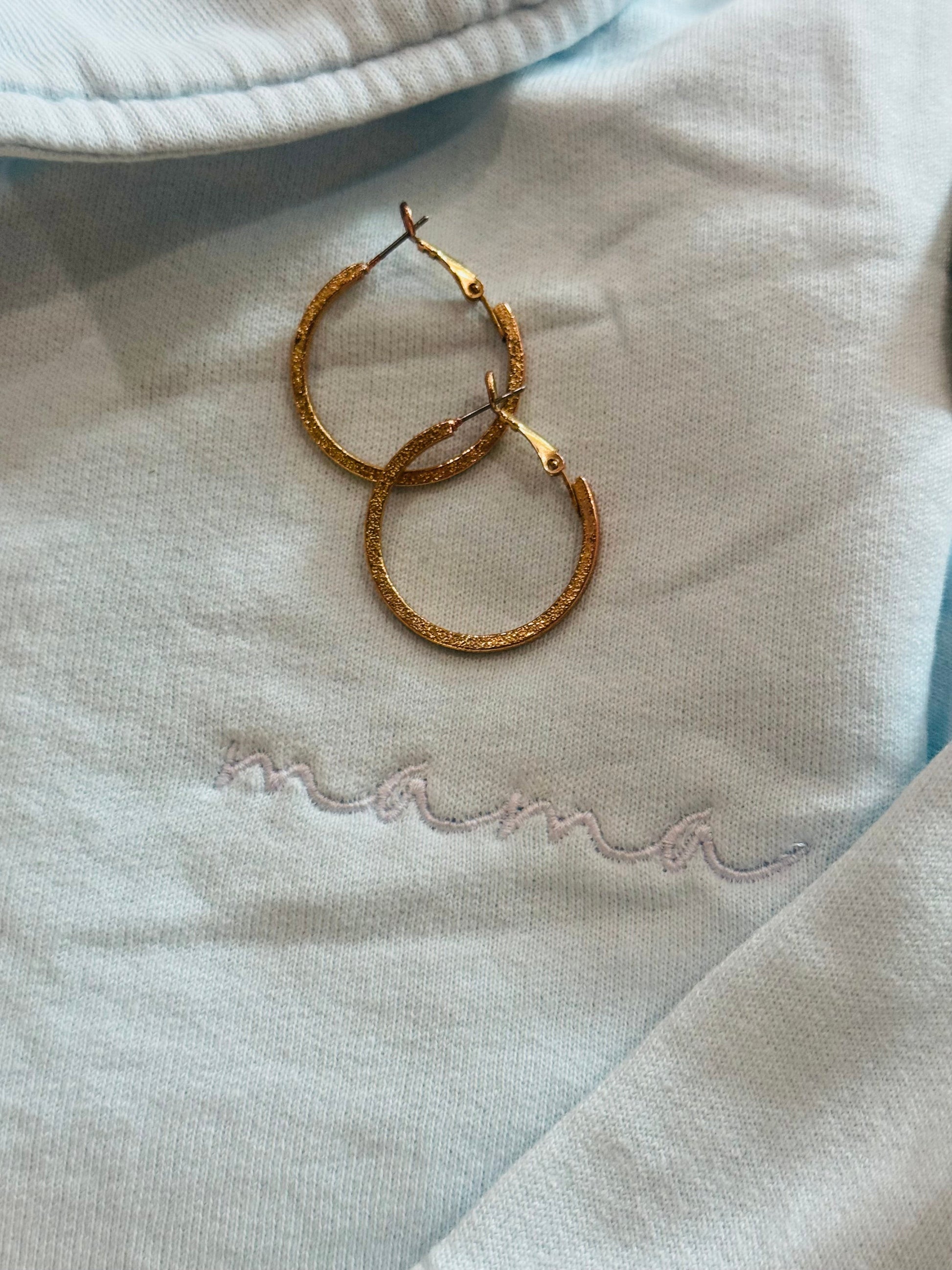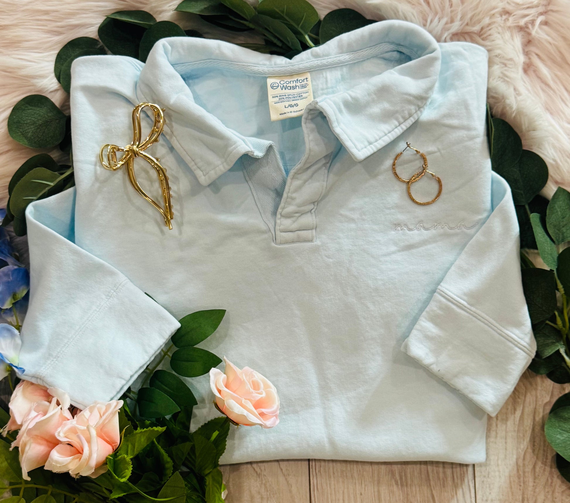 Chambray Dainty Mama Embroidered Split Neck Sweatshirt
