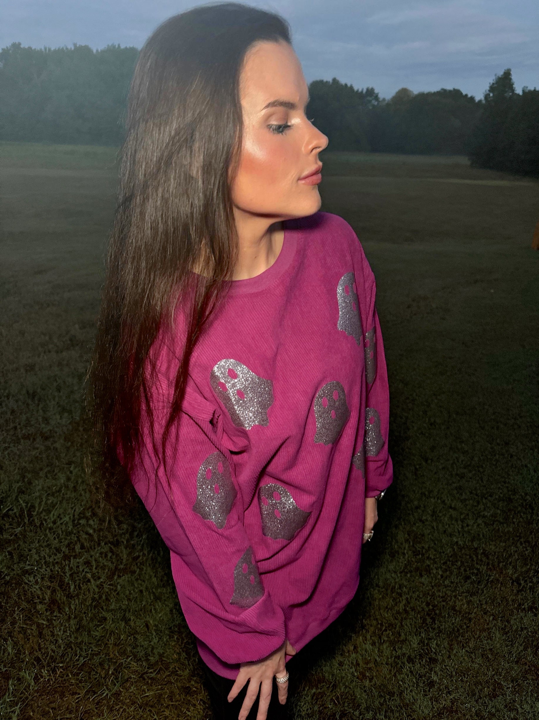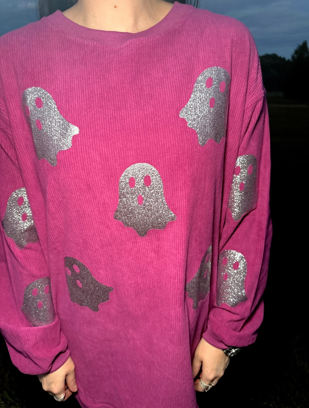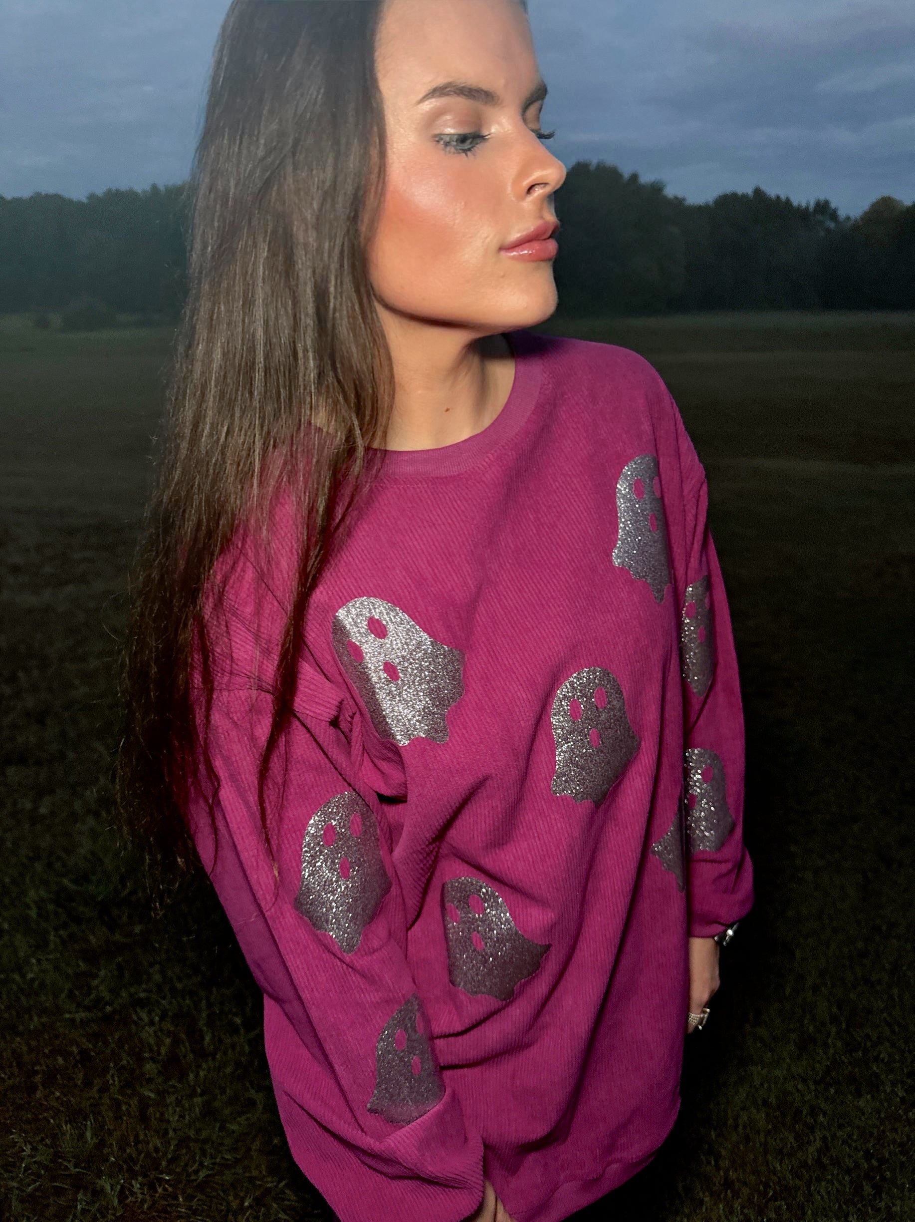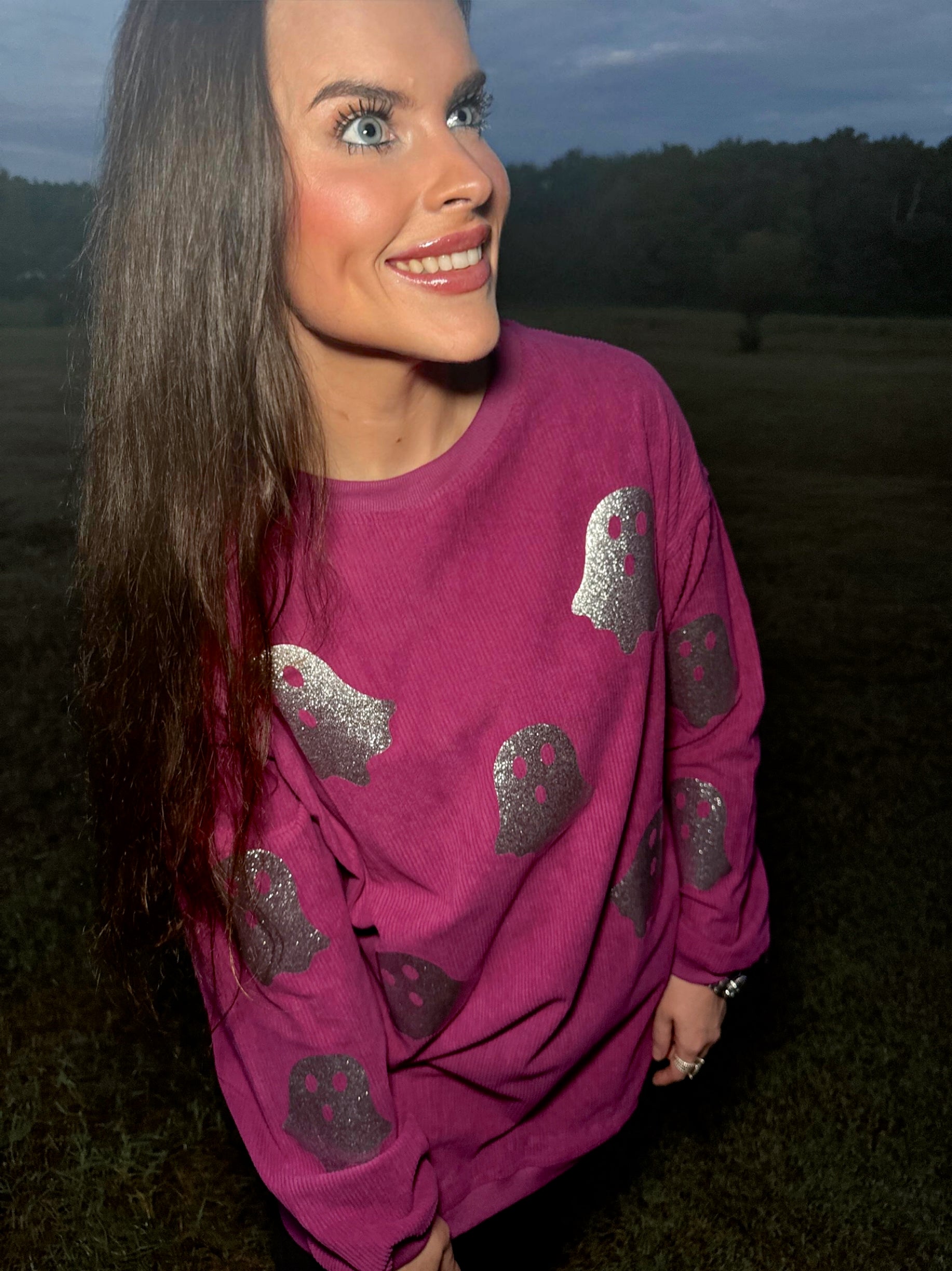 Magenta Glitter Ghost Corded Crew