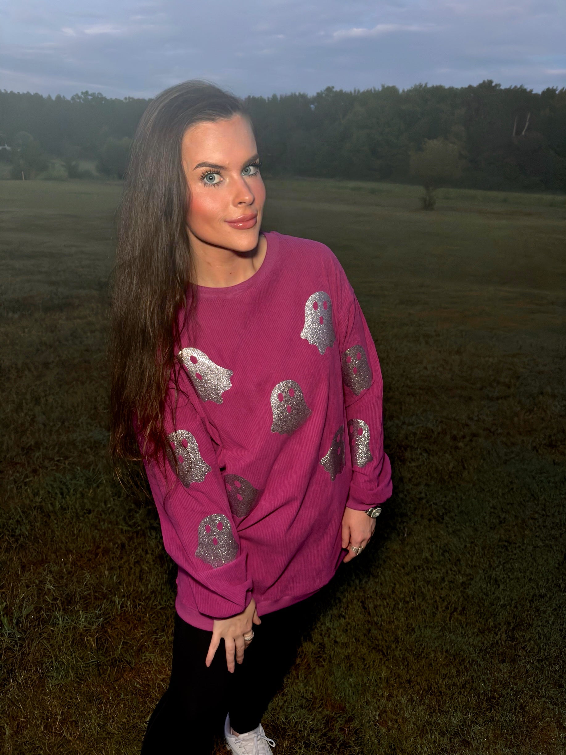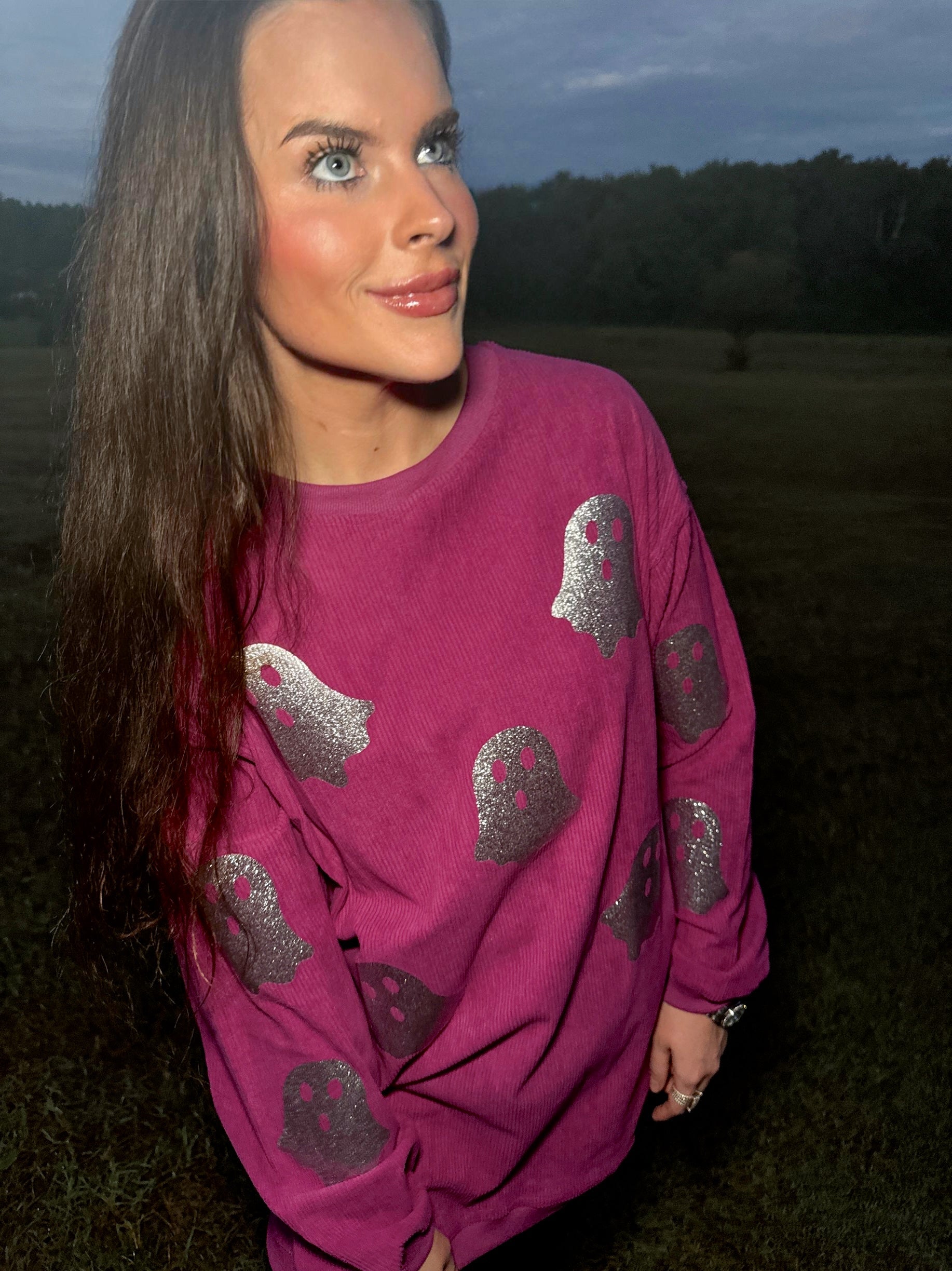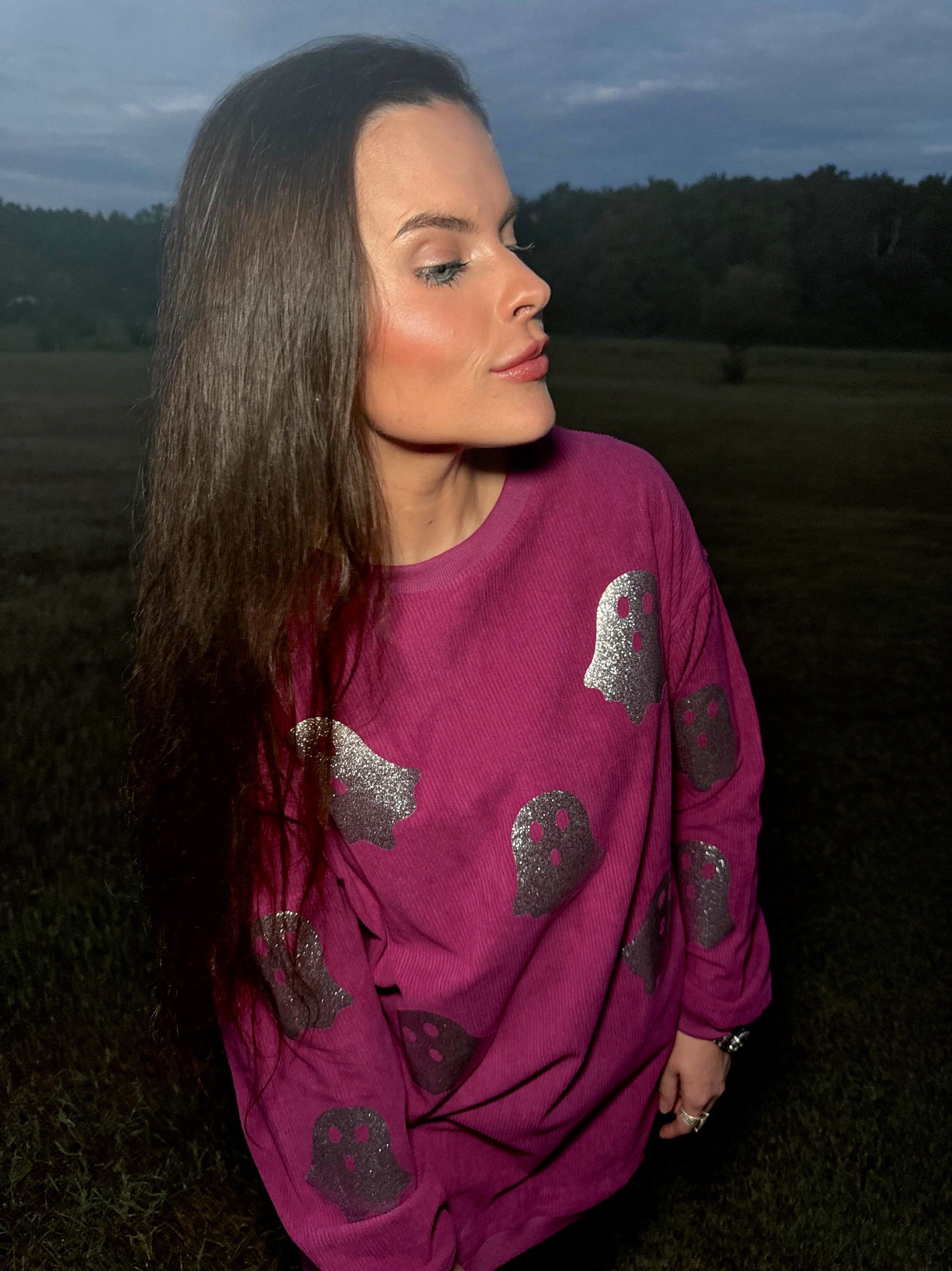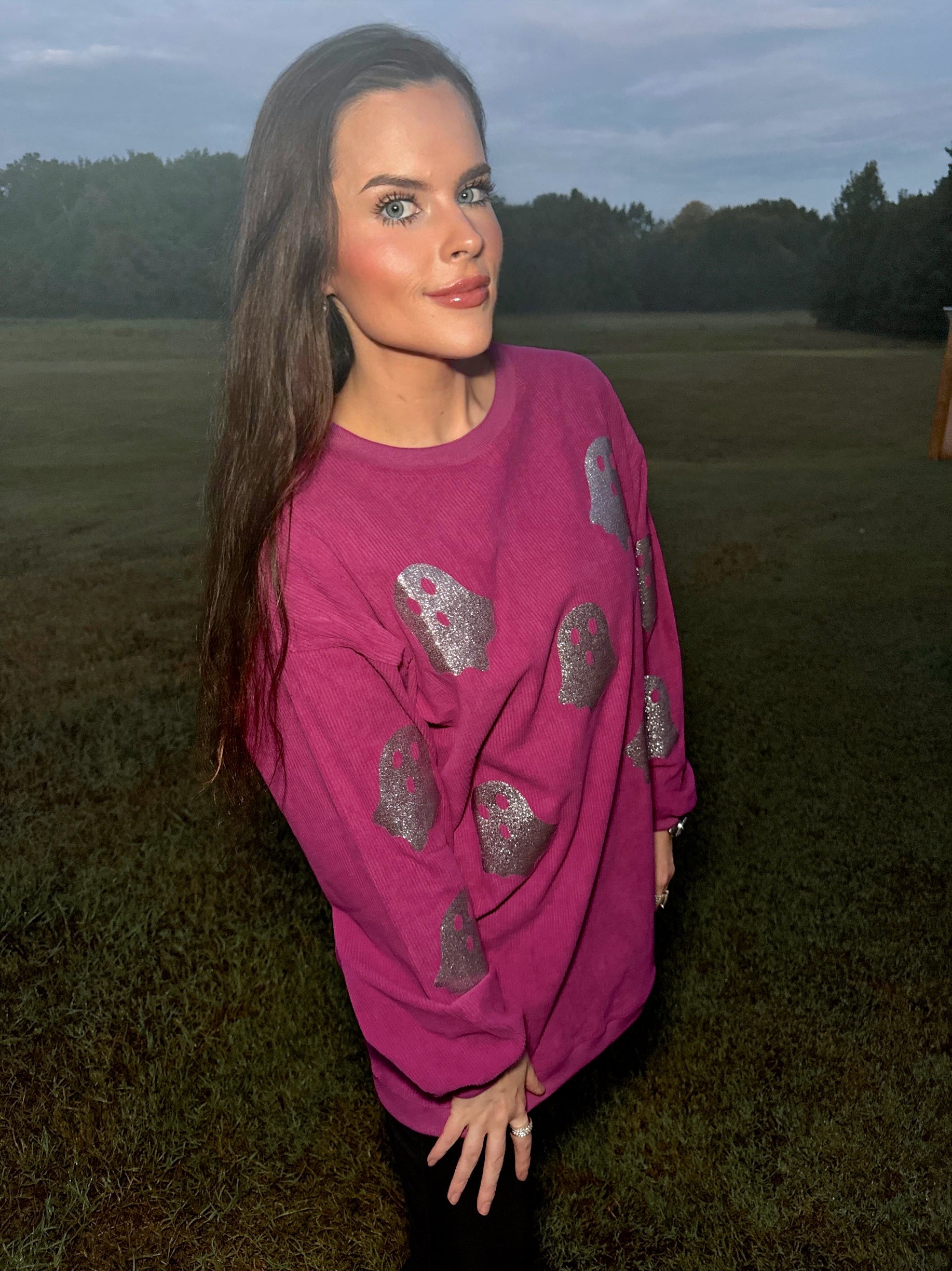Magenta Glitter Ghost Corded Crew
