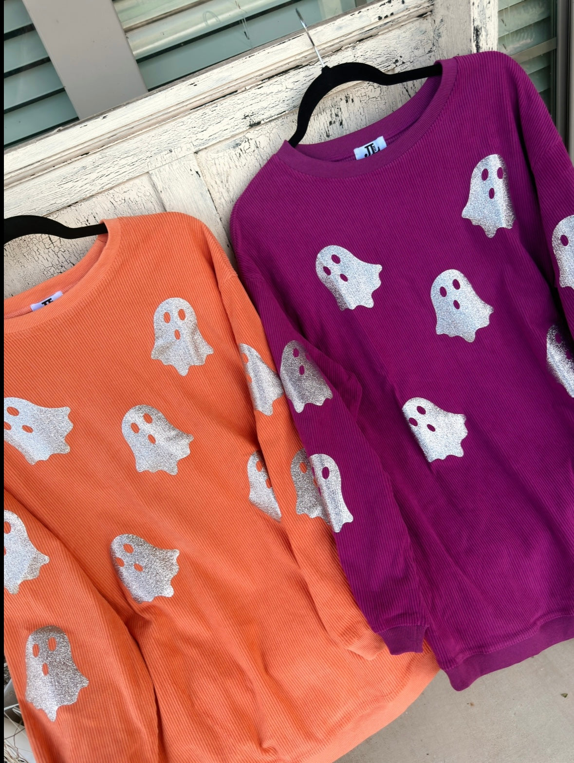 Add a touch of spooky style to your wardrobe with our glitter ghost corded crews! This relaxed fit top is perfect for casual outfits and features a playful ghost design in shimmering glitter. Get ready to turn heads (and maybe even spooks) with this quirky and unique top.