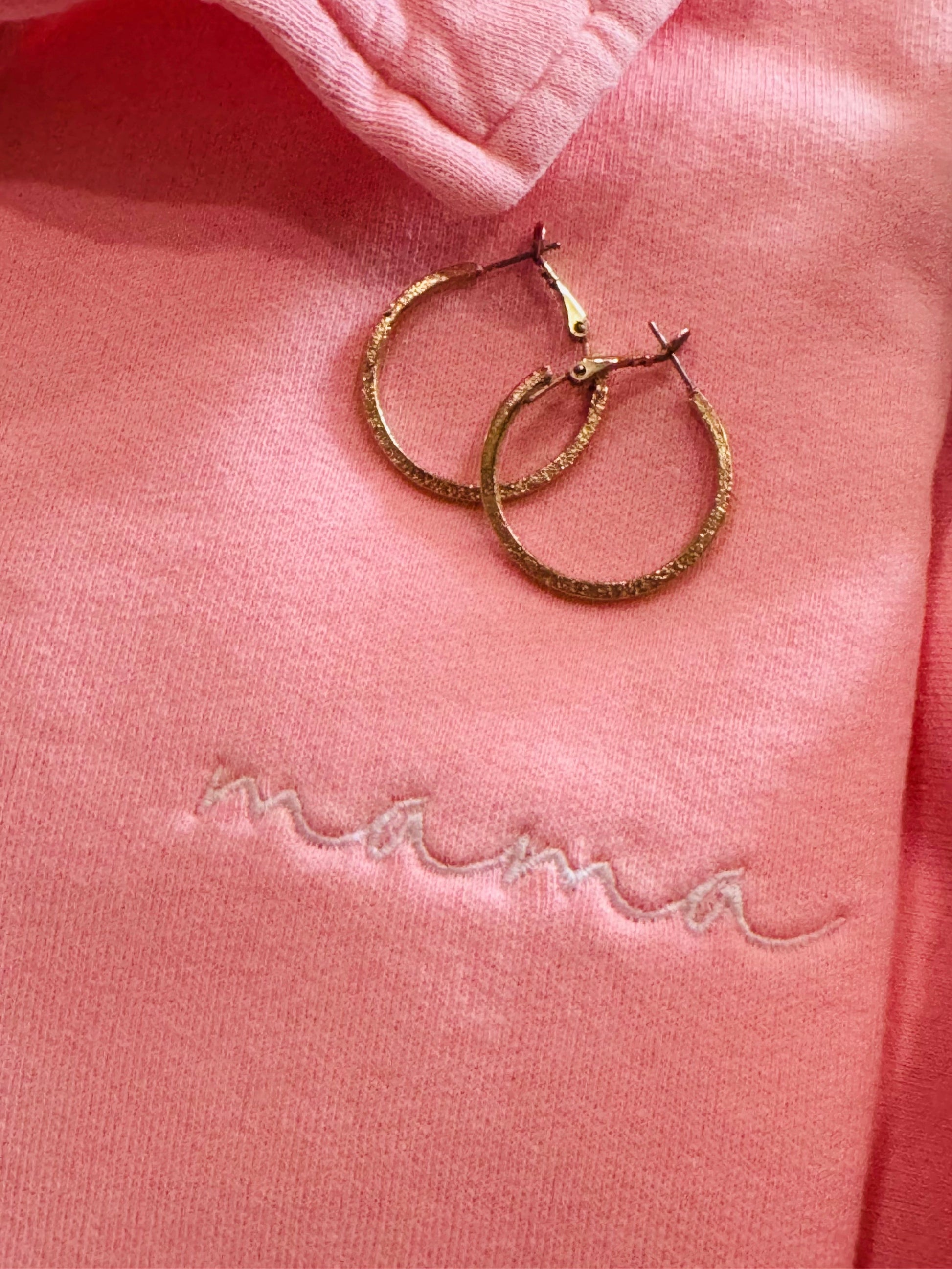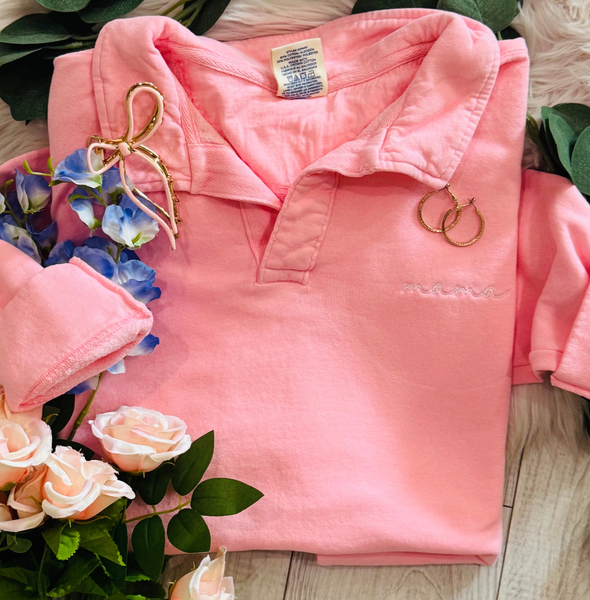 Neon Pink Dainty Mama Embroidered Split Neck Sweatshirt