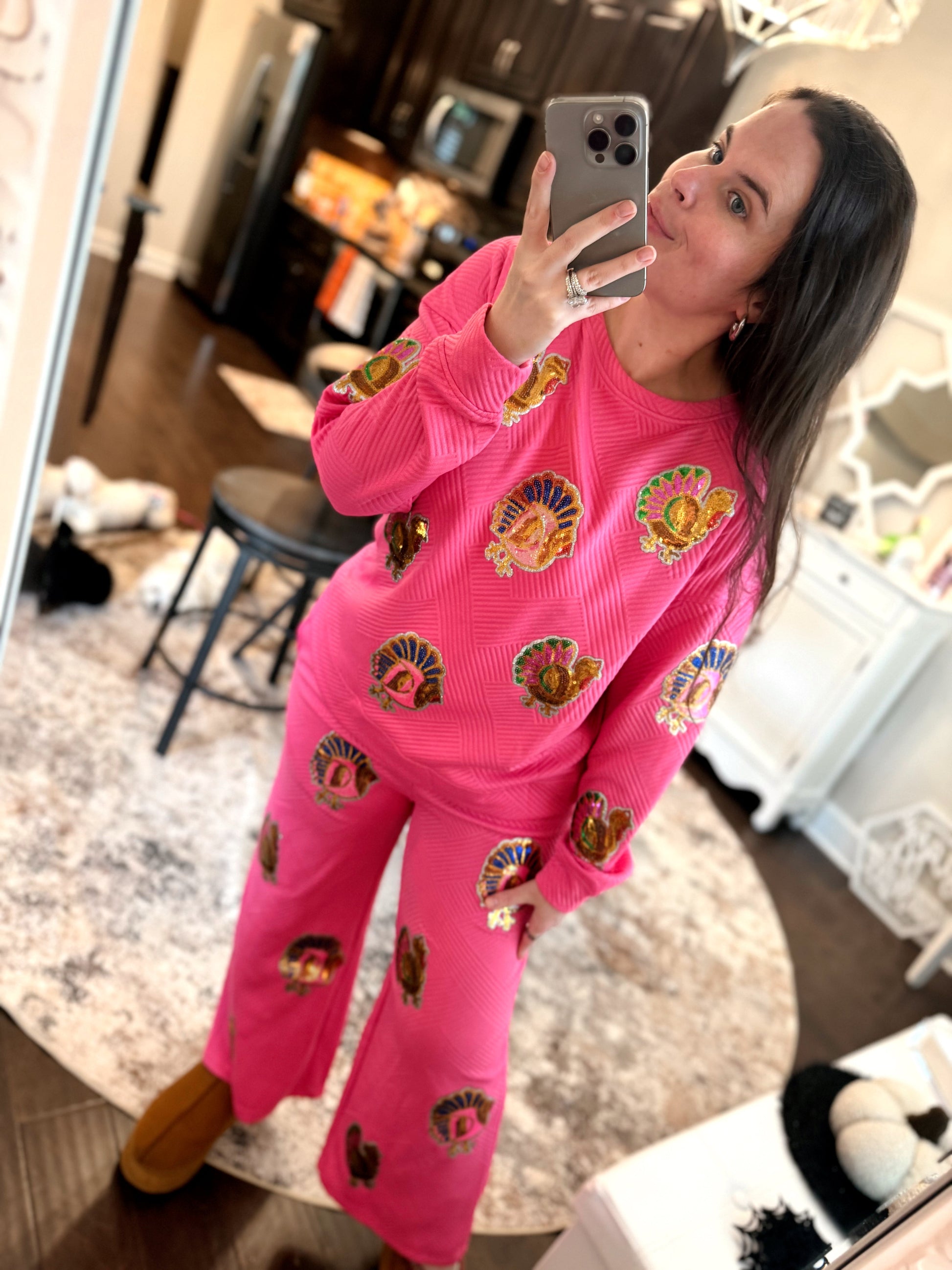 Textured set with functional drawstring waist. I’m 5’0 wearing a size medium. These have a capri fit with a flare leg. True to size! Preorder closes 10/14 with ETA 2-3 weeks after preorder closing.
