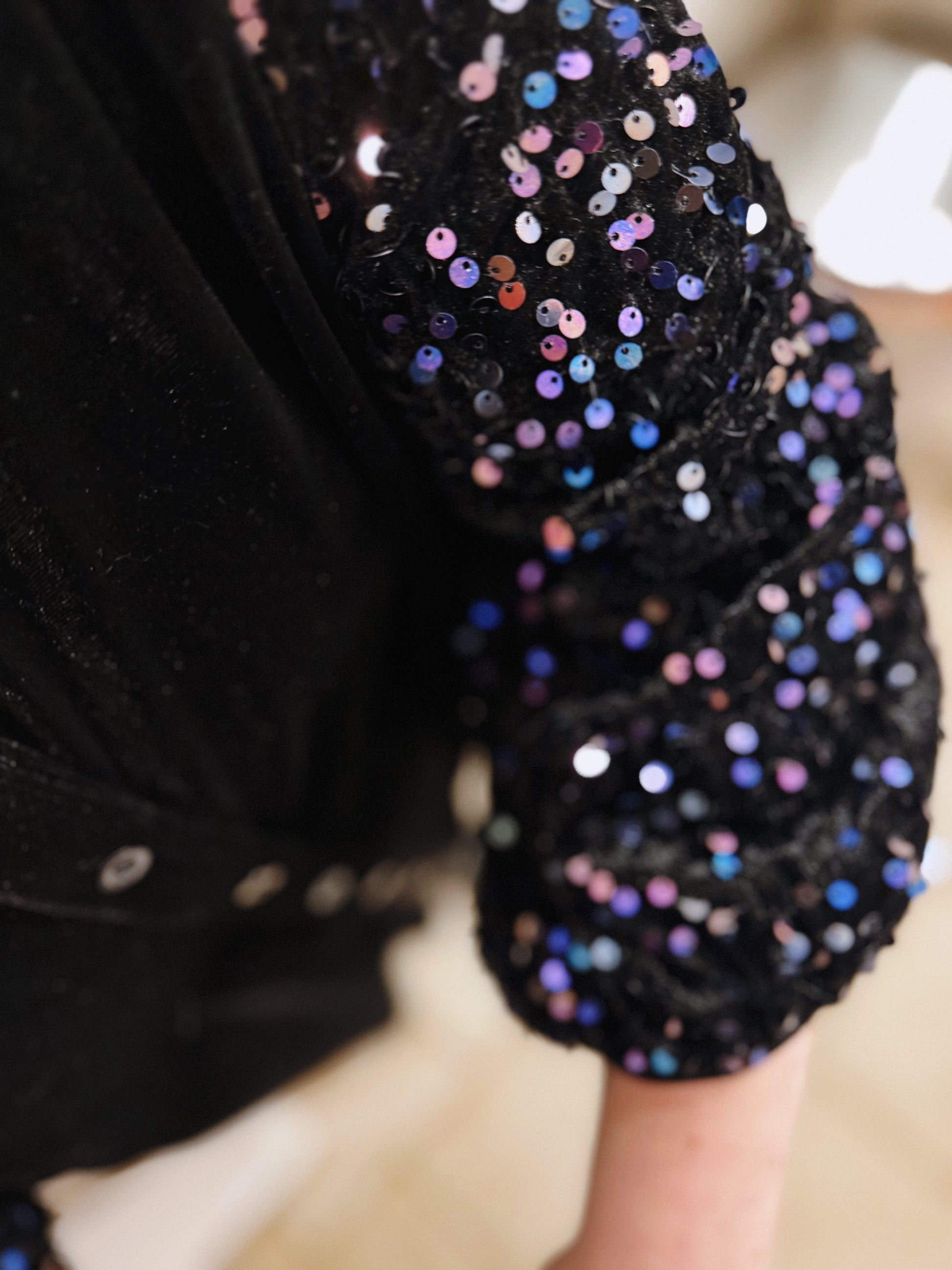 RTS! Look absolutely stunning in this J. Lee piece! It's the perfect pick to dazzle the night away at your holiday parties and New Year's Eve celebrations. Its black velvet fabric paired with iridescent sequin 3/4 length balloon sleeves make this unique piece sure to get you noticed! So shimmer and shine your way towards 2024!